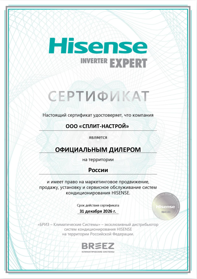 3 года гарантия от производителя Hisense. 3 года сервисная гарантия от климатической компании Сплит-Настрой.